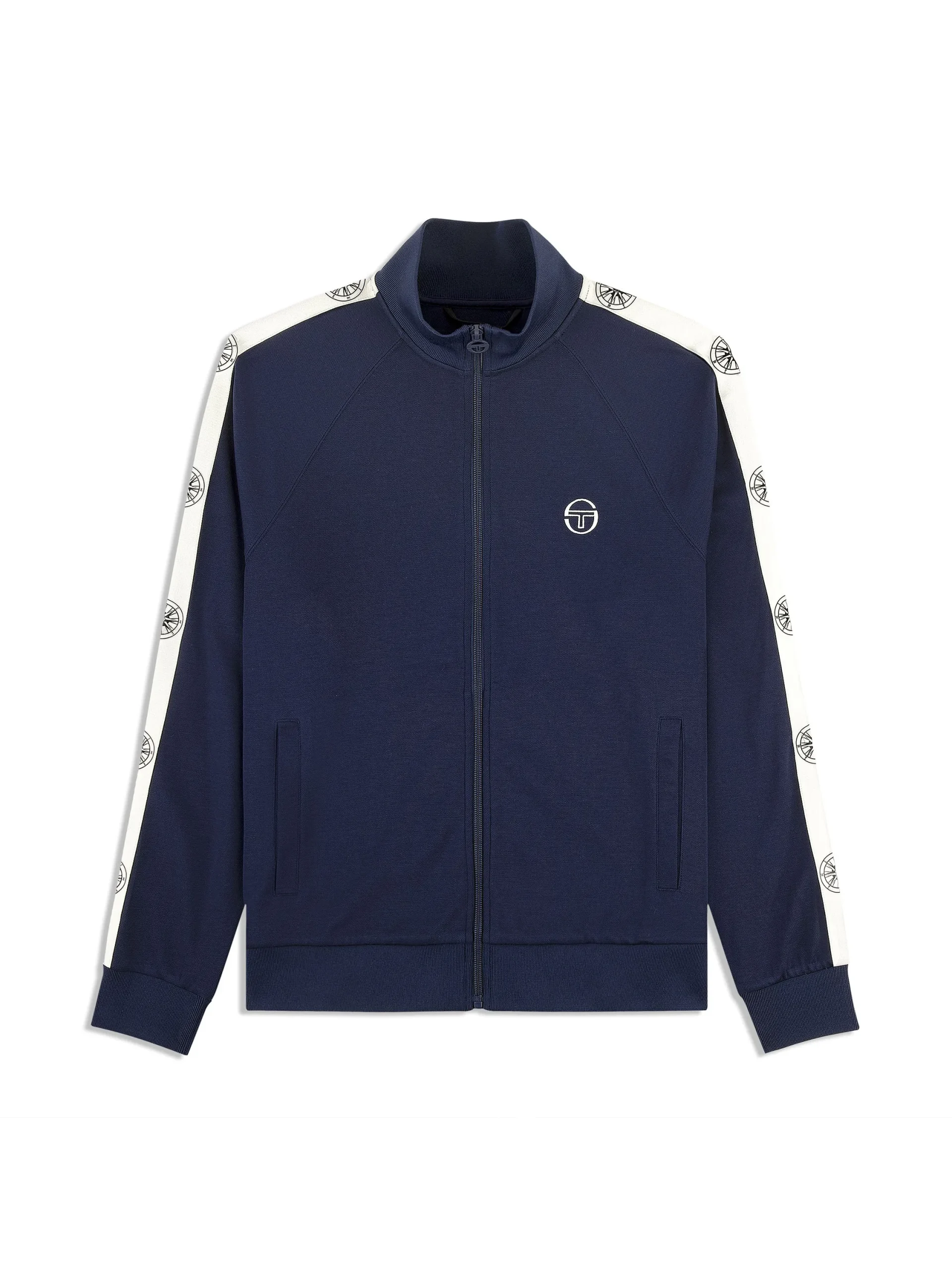 Set sail in the Bussola Track Jacket, crafted from a luxurious Tencel blend piqué fabric that’s soft and breathable with a subtle stretch—perfect for active individuals and athleisure-wear enthusiasts alike. Featuring a nautical “Compass” rose repeat motif across contrast taping down the sleeves, this refined track jacket offers style and comfort with a Riviera vibe.