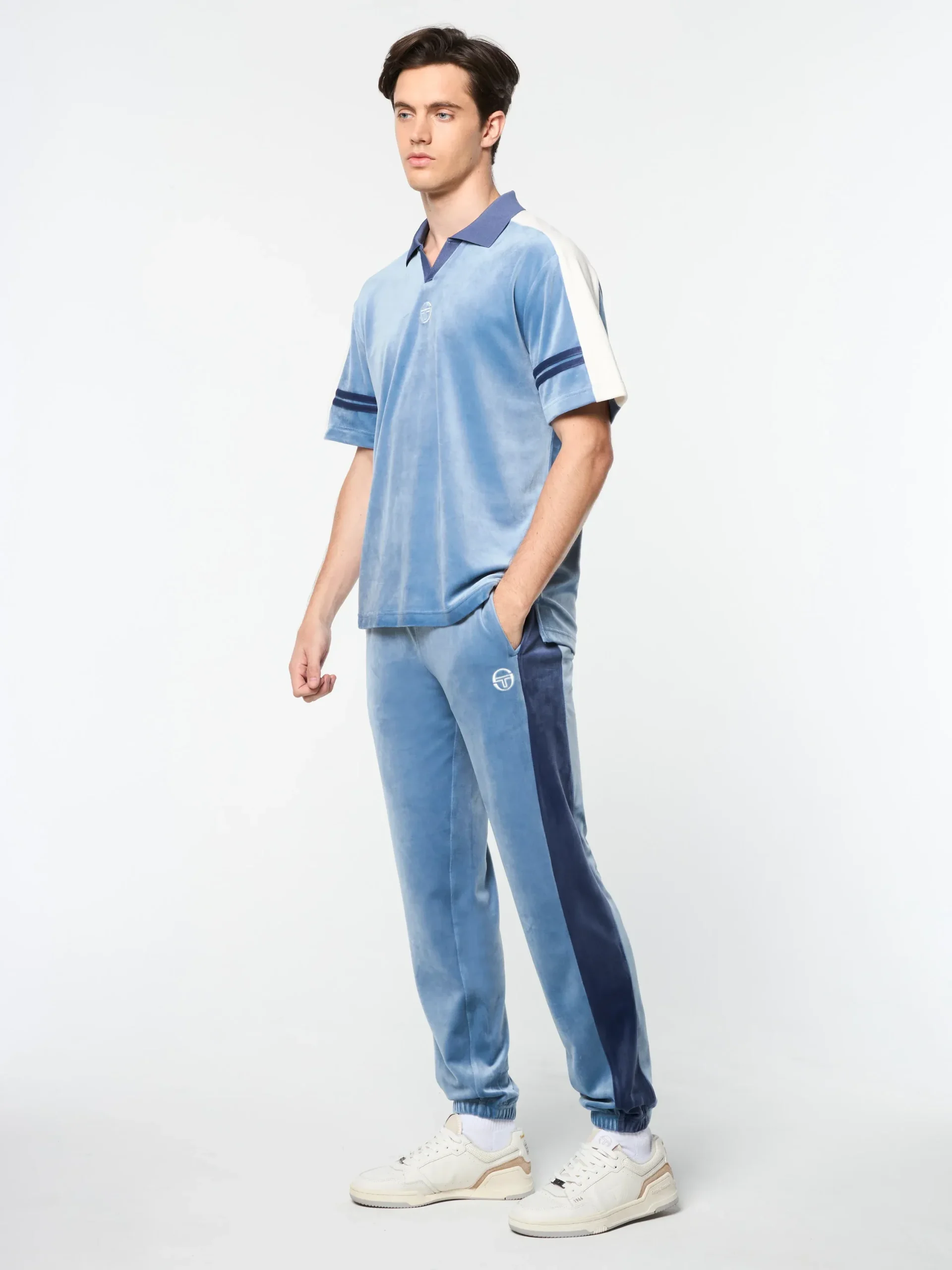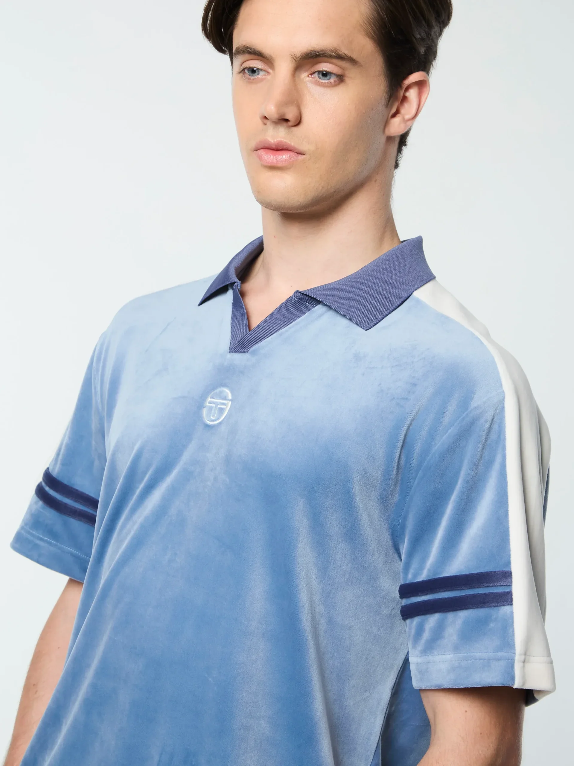 Inspired by a timeless design from our archive, the Cielo Velour Polo blends heritage aesthetics with modern functionality. Crafted from luxurious velour in a retro color-blocked silhouette, this premium polo features contrast taping stripes, an embroidered ‘ST’ monogram at the chest, and a notched Johnny collar for extra style points.